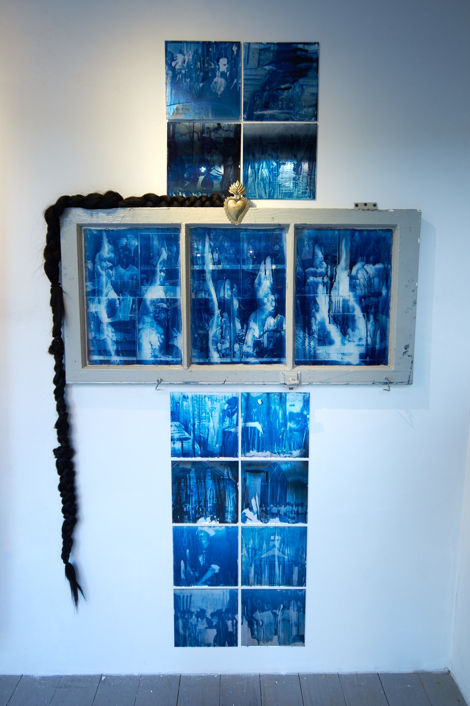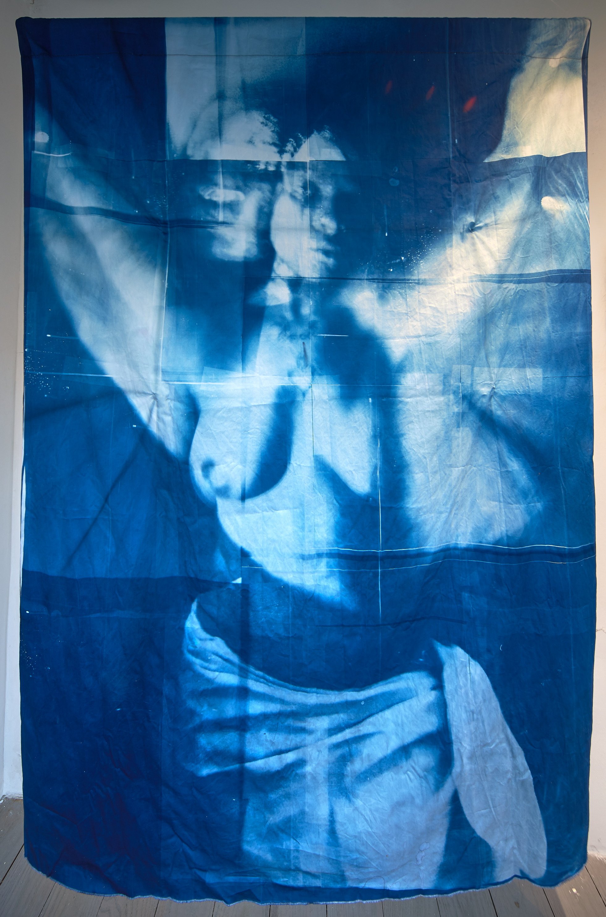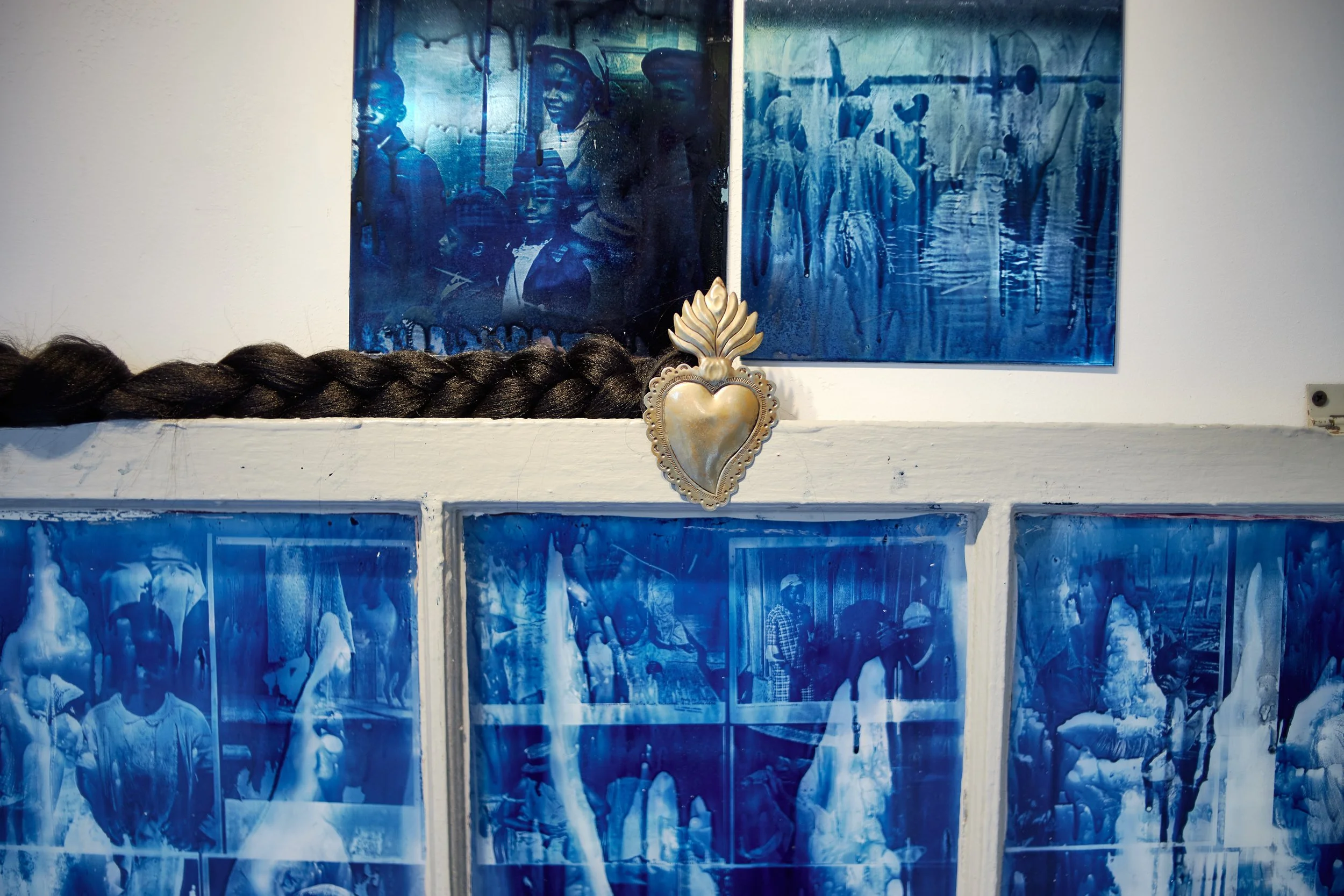 We can often read our inner questioning as turmoil and rush to avoid its discomfort. But in the same light, we must ask ourselves what or who our avoidance serves? What hidden truths do those questions reveal? A Shrine for Self-Determination asks for stillness so those questions can offer direction(s) toward collective freedom. Working in cyanotype and utilizing found objects and archival photographs of Southern sharecroppers, Fuller composes spectral portraits that summon our environments and name systems of oppression. A seraphic figure protects the altar and enshrines a resistance that survives beyond us, renewing itself in every generation– eternally.